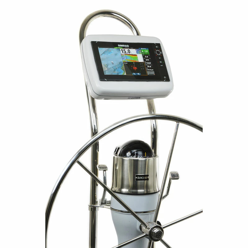 The NavPod SailPod is pre-cut for the Simrad NSS9 evo2 and B&G Zeus2 9 and it fits a 9.5″ wide guard. SailPods are the smart solution for mounting your radar or chartplotter at the helm, where you can easily operate and clearly see the fine details of the screen. NavPods have a high-gloss finish, giving you a clean mounting solution while concealing unsightly wires. Nickel-chrome-plated tamper-proof screws provide a little bling and a lot of security. Designed with a double gasket waterproof seal, NavPods protect your electronics from the harshest of wet offshore boating conditions. A SailPod is best mounted on a Single Bend AngleGuard or use a Double Bend AngleGuard to fit an InstrumentPod on the top vertical section and SailPod below on the angled section.