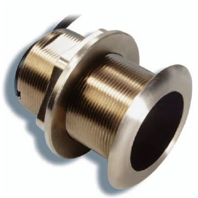 This entry-level tilted bronze transducer accommodates hull deadrise angles of 8Β° to 15Β° without a fairing.